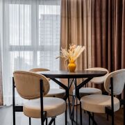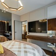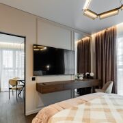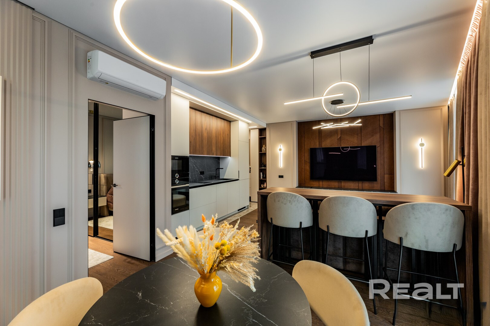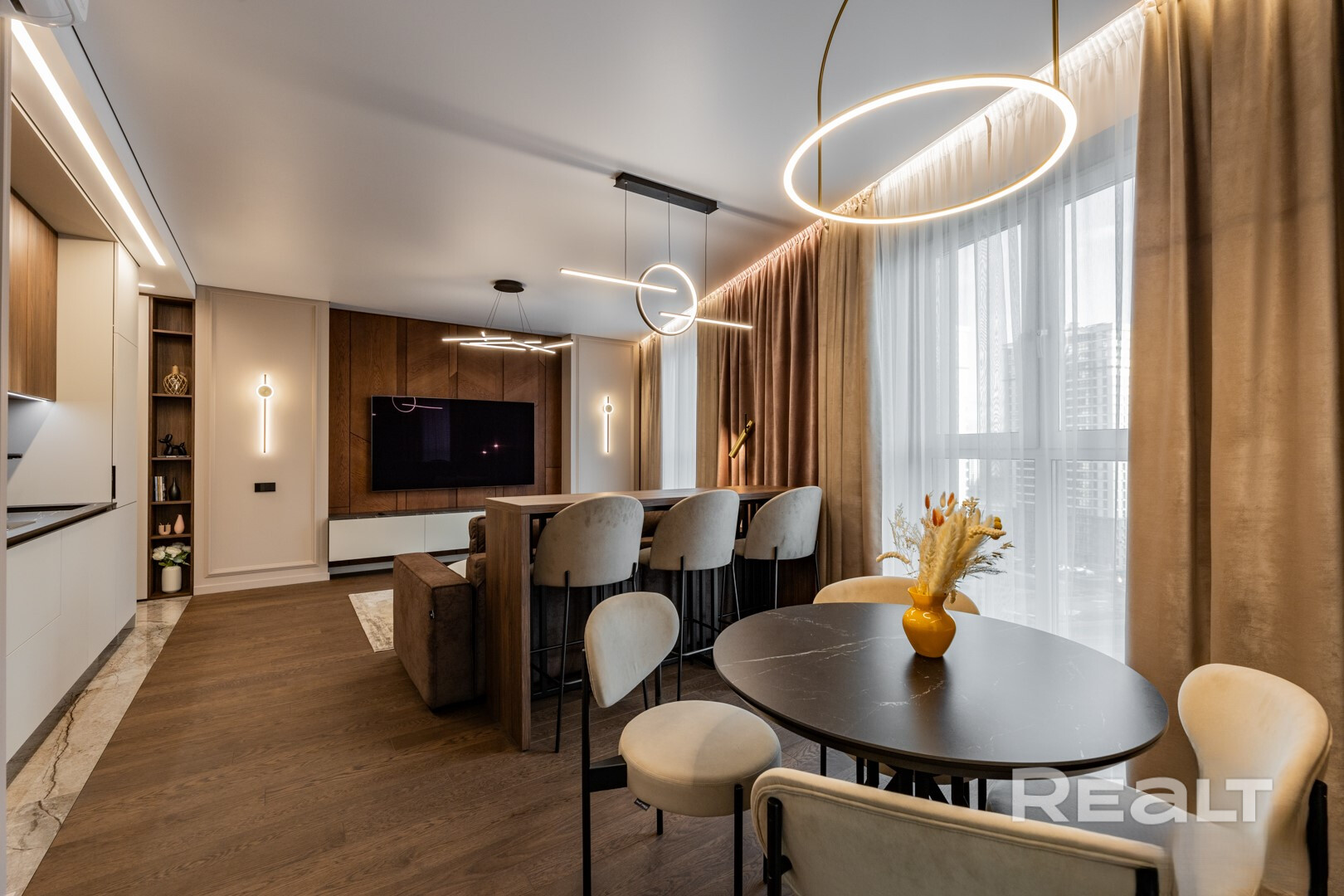 Квартира находится в престижном комплексе Minsk World, в непосредственной близости от Международного финансового центра, станции метро "Аэродромная" и торгово-развлекательного центра "Авиа Молл". Окна квартиры выходят на прекрасный вид, не упирающийся в соседние дома.