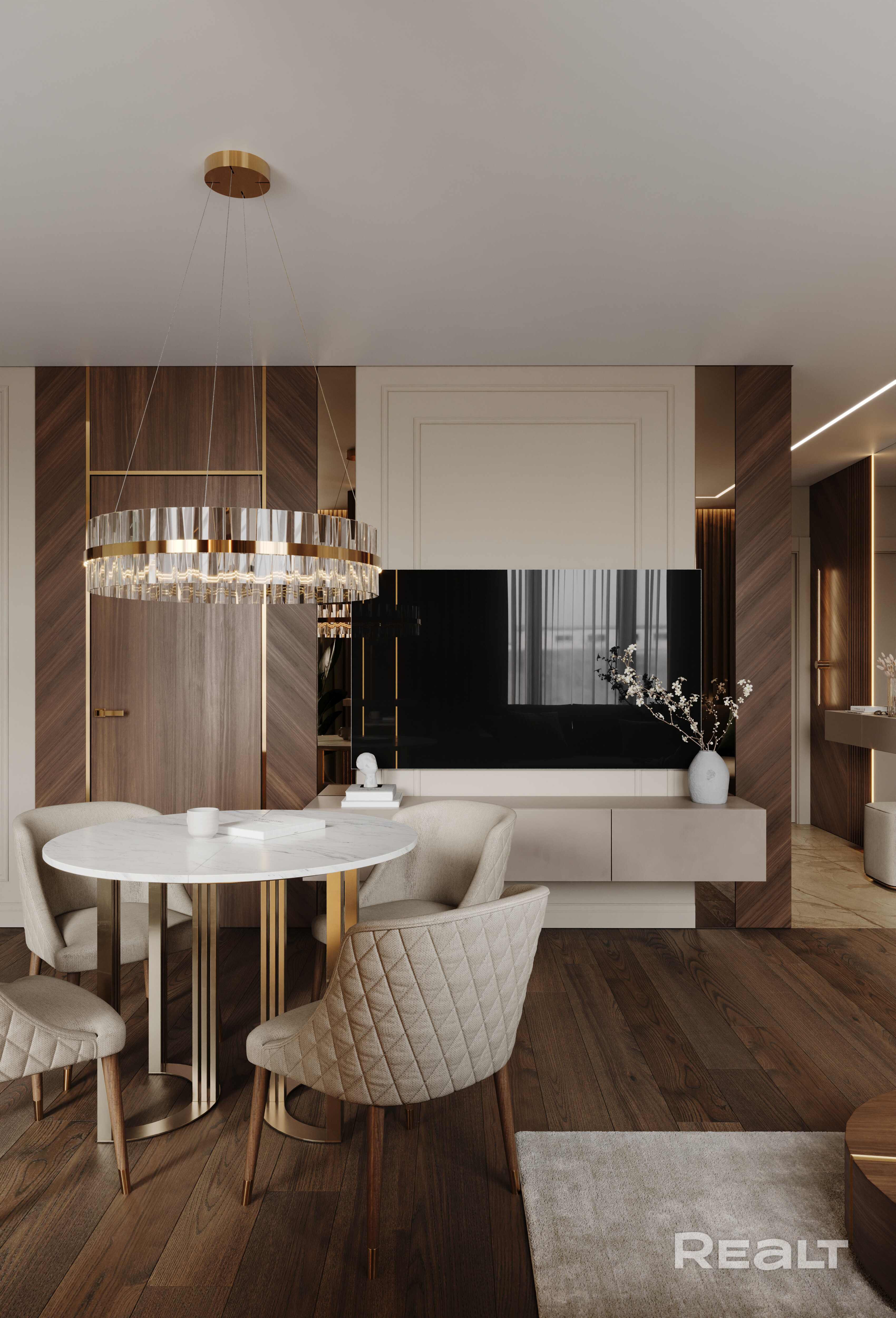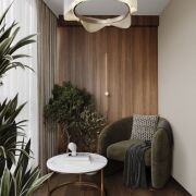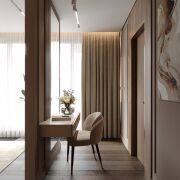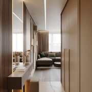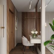 Общая площадь квартиры составляет 61,3 кв. м, из которых 51,1 кв. м — жилая. Просторная кухня-гостиная и мастер-спальня с гардеробной имеют два балкона: один открытый, а второй застекленный, где удобно расположился кабинет. В прихожей встроен вместительный шкаф.