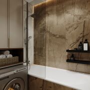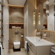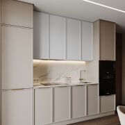Кухня оборудована современной техникой от ведущих производителей: духовой шкаф, варочная панель, микроволновая печь, посудомоечная машина и холодильник. В ванных комнатах установлена сантехника Hansgrohe и Villeroy Boch, а также керамогранит премиум-класса.