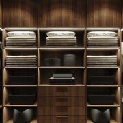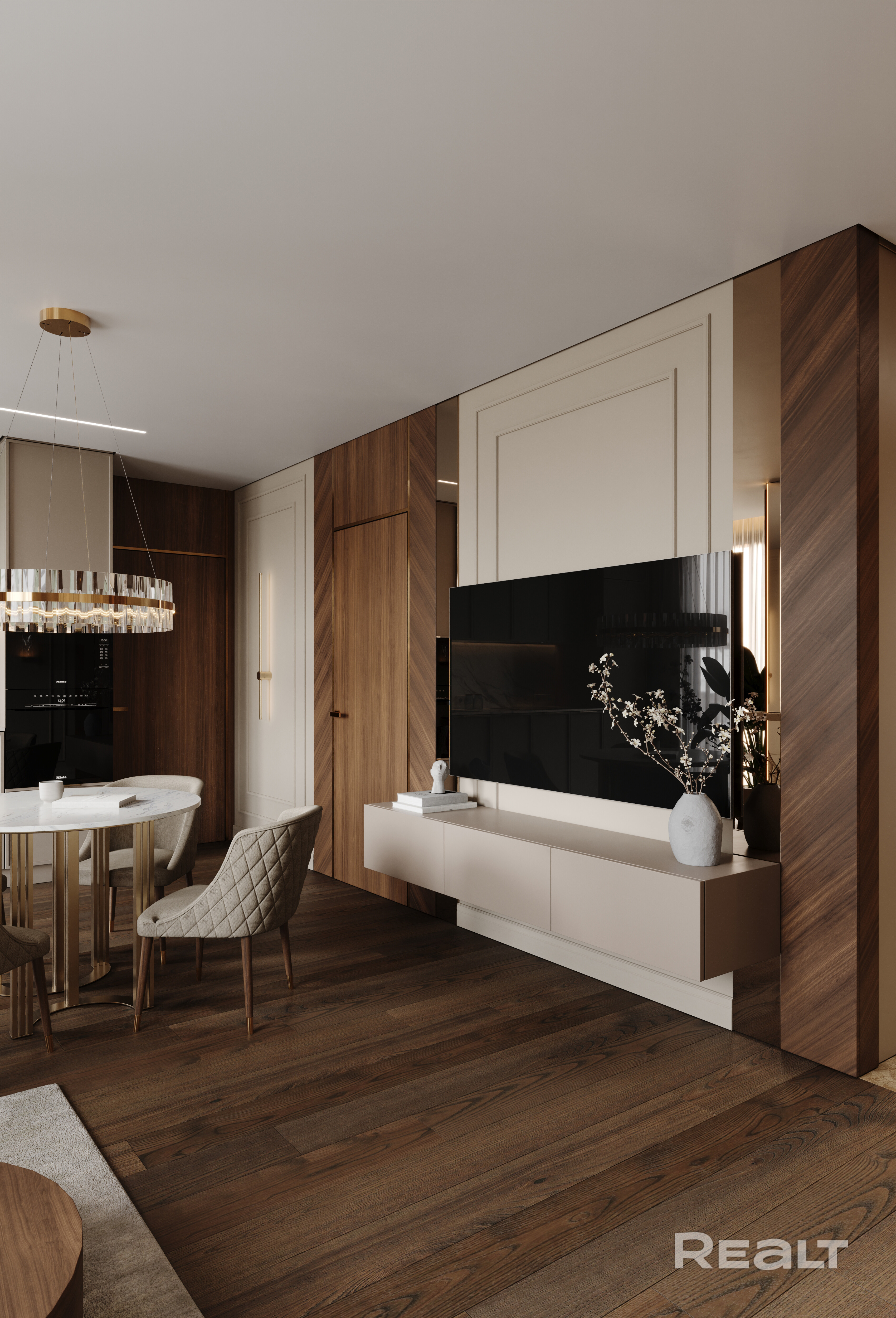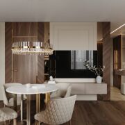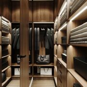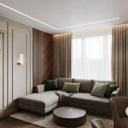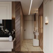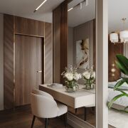 Планировка квартиры продумана до мелочей. В отделке использованы только высококачественные материалы: на полу — паркетная доска и керамогранит, стены оформлены шпонированными панелями, двери от известного бренда "Лацио". Мебель изготовлена по индивидуальному дизайн-проекту.
