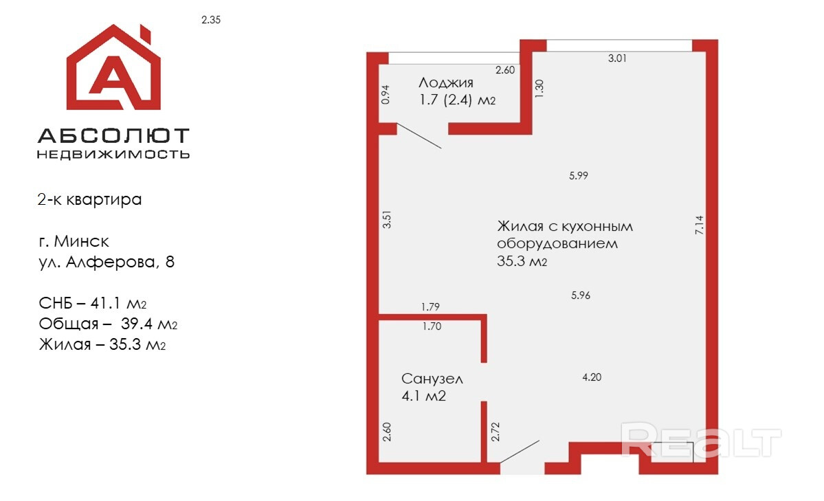 Квартира: площадь квартиры по СНБ - 41,1 м2, общая площадь - 39,4м2, жилая – 35,3м2.