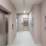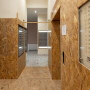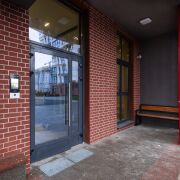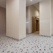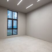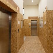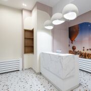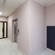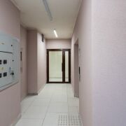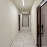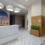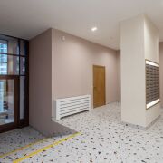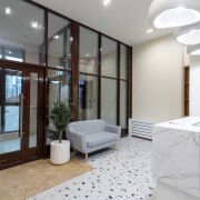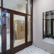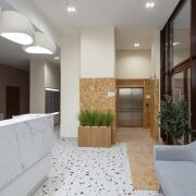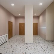 Лобби в доме сквозное. Его площадь более 60 м2 и высотой потолков более 3 метров.