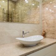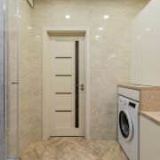 Здесь чувствуется рука дизайнера. Основной упор сделан на качество материалов и гармонию. Особого внимания заслуживает санузел, где элегантный керамогранит сочетается с благородной фактурой натурального камня в душевой. Это не только красиво, но и практично на десятилетия вперед.