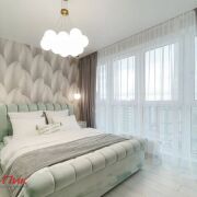 При отделке использовались дорогие и качественные материалы. Квартира полностью укомплектована всей мебелью и бытовой техникой. Установлена стильная кухонная мебель с фасадами Egger. В гостиной размещена обеденная группа, большой диван с дополнительным местом для сна, а также в квартире две спальни с двуспальными кроватями, шкафами и рабочим местом.