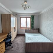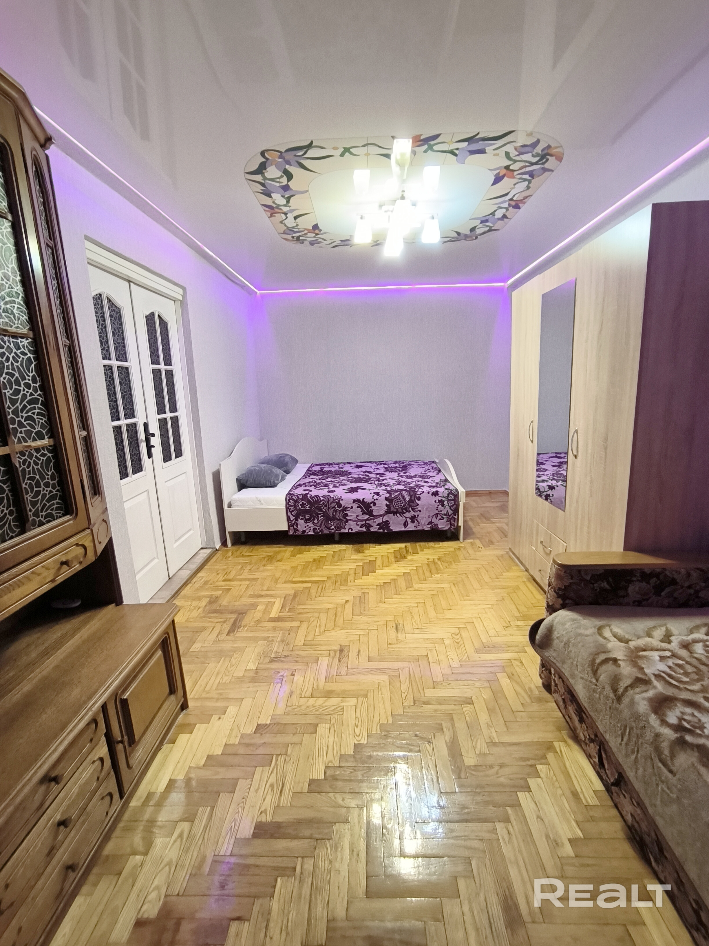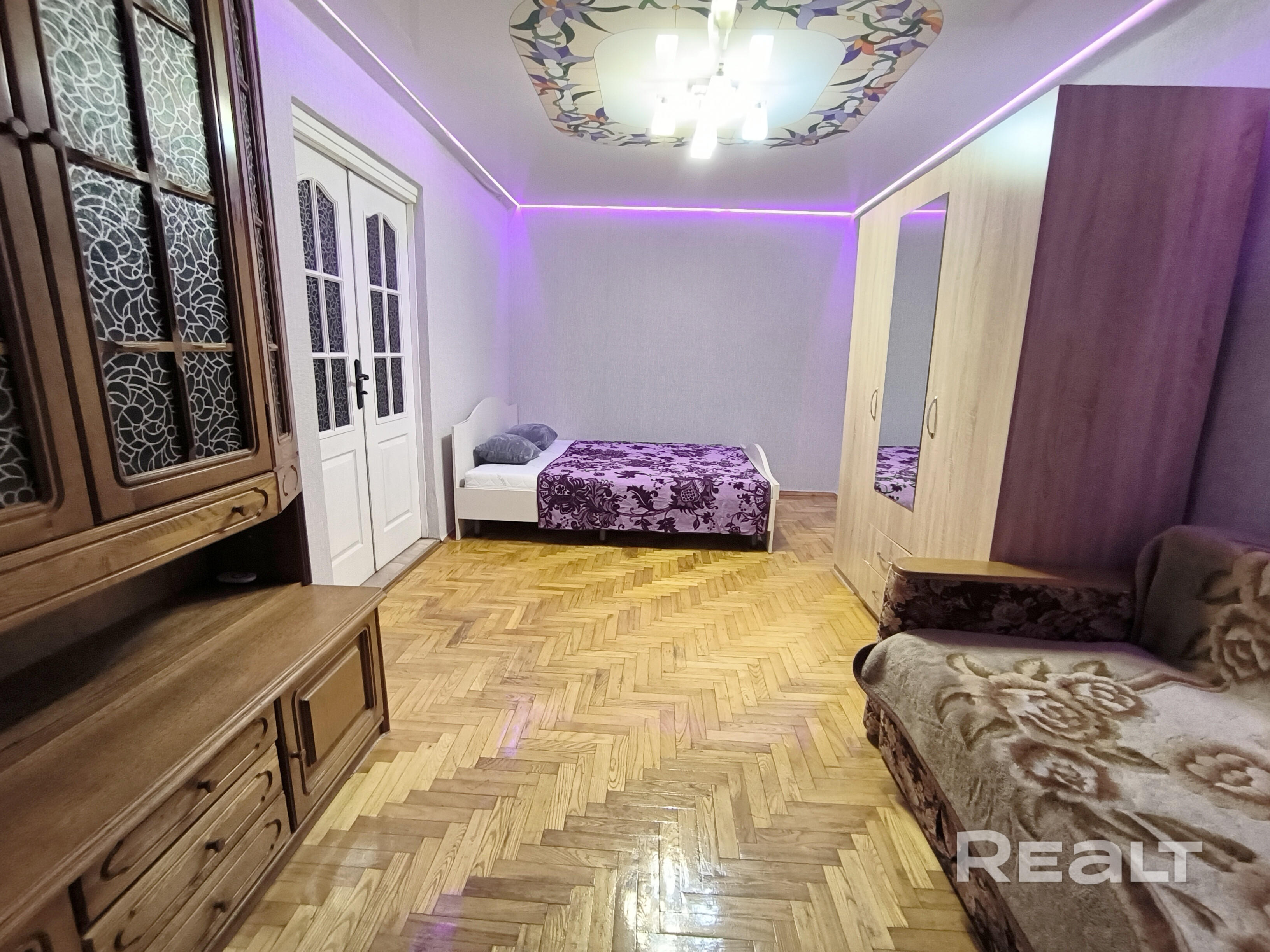 Комнаты оклеены обоями, потолки натяжные, на полу в большой комнате (17,4 м.кв.) – паркет, а в той, что поменьше (12,2 м.кв.) – ковролин.
