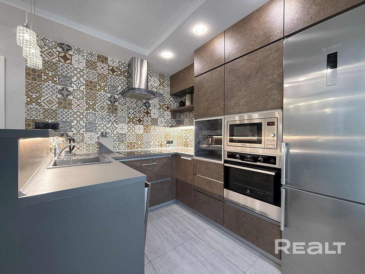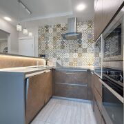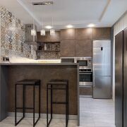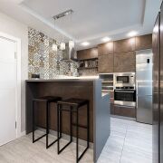 Встроенная кухня с барным столом, декоративной подсветкой рабочей зоны, доводчиками Blum и встроенной техникой (индукционная варочная поверхность, духовой шкаф, вытяжка, посудомоечная машинка, холодильник, встроенная СВЧ-печь, винный шкаф).