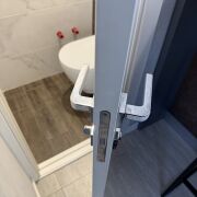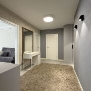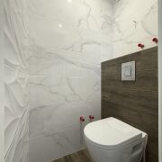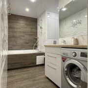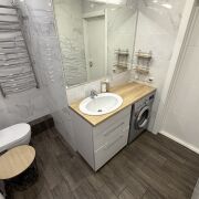 Санузлы облицованы плиткой, установлены инсталляции Groheс подвесными унитазами, угловая ванна, тумба со столешницей, большое зеркало с подсветкой, стиральная машинка LG, а все коммуникации спрятаны за скрытым люком. Есть подготовка под гигиенический душ и бойлер.
