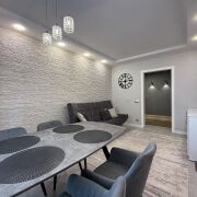 Напольное покрытие в кухни-гостиной и коридоре-импортный керамогранит, а в жилых комнатах паркетная доска. Стены в жилых комнатах оклеены импортными обоями, а в кухне-гостиной и коридоре декоративная штукатурка. Потолок выровнен и окрашен с добавлением конструкций из гипсокартона с точечными светильниками и люстрами.