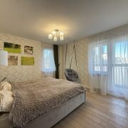 Взрослая спальня с выходом на лоджию и дополнительным окном, оснащена кроватью с подъёмным механизмом и встроенным шкафом купе.