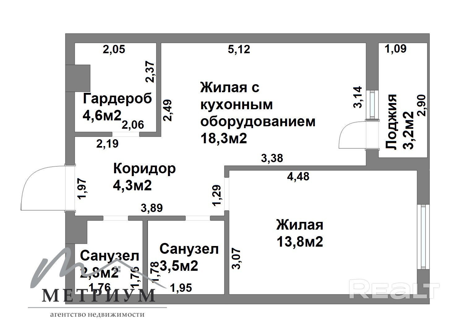 Огромным плюсом квартиры является наличие большой гардеробной, куда можно разместить всю систему хранения для всей семьи, что сохранит место в жилых комнатах. Либо, сделав небольшую перепланировку - добавить ещё одну полноценную комнату!