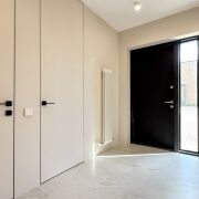 Вас встречает просторная прихожая (11,5 м2) с огромным встроенным шкафом с зеркалом в пол и теневой подсветкой. Двери скрытого монтажа в потолок создают эффект идеально гладких стен.