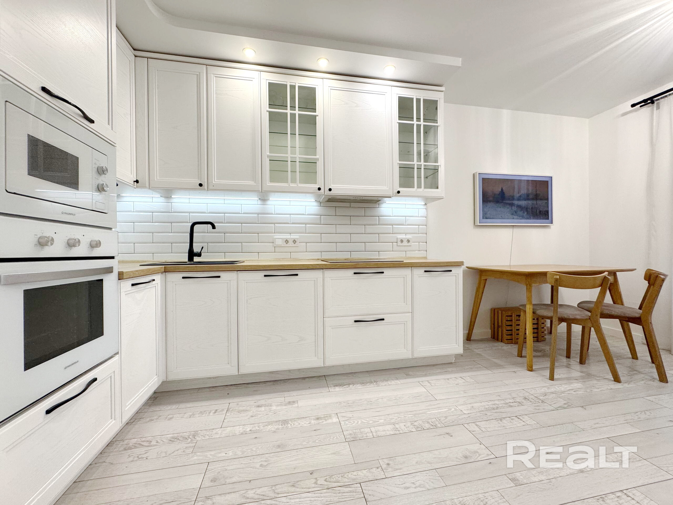· Кухонная техника: Вся необходимая встроенная техника премиум-класса: индукционная варочная панель Bosch, духовой шкаф и микроволновая печь Maunfield, вытяжка, посудомоечная машина Hotpoint Ariston.