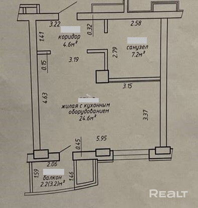Площадь: по СНБ — 38,6 м2/общая — 36,4 м2