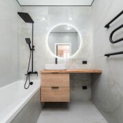 - Подсветка: кухня, карниз, подполочная зона, зеркало в санузле, зеркало в спальне, бра.