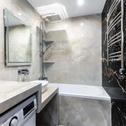 - В квартире выполнен свежий, качественный ремонт: выполнена переделана разводка электропроводки, с выводом новых точек и вводной группой в квартиру, выключатели и розетки Schneider Electric, заменены сантехнические подводы, стены выровнены и окрашены матовой моющейся краской, во всей квартире смонтированы потолки из гипсокартона со встроенными светильниками, на полу уложен ламинат Joss Beaumont, качественный керамогранит, в санузлах уложена плитка производства Испания, установлена инсталляция TECE, бойлер Termex, установлена акриловая ванна пр-во Чехия Ravak, полотенцесушитель жидкостный электрический, установлены плинтуса и межкомнатные двери из массива дуба, входная дверь металлическая (толщина полотна 1,5 мм).Фасады кухонного гарнитура крашенный МДФ, индукционная варочная панель, духовой шкаф, посудомоечная машина 45см фирмы Electrolux,встроенный холодильник Liebherr, лоджия утеплена по периметру, в комнате установлен кондиционер TCL.