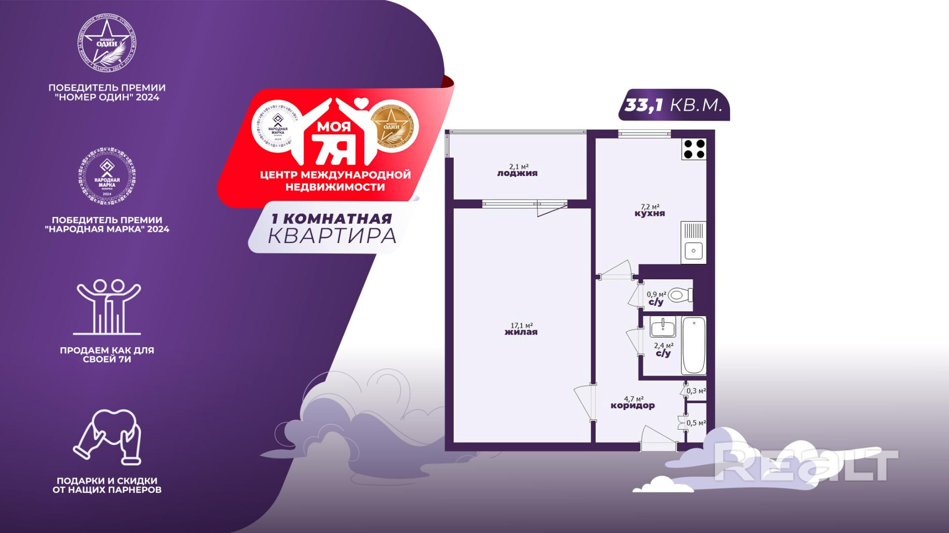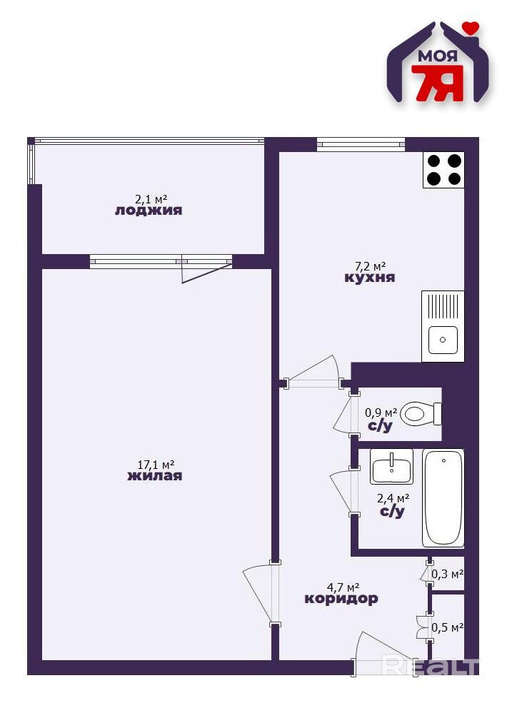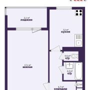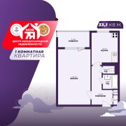 - Квартира общей площадью 33,1 кв.м. с жилой комнатой 17,1 кв.м. и кухней 7,2 кв.м.