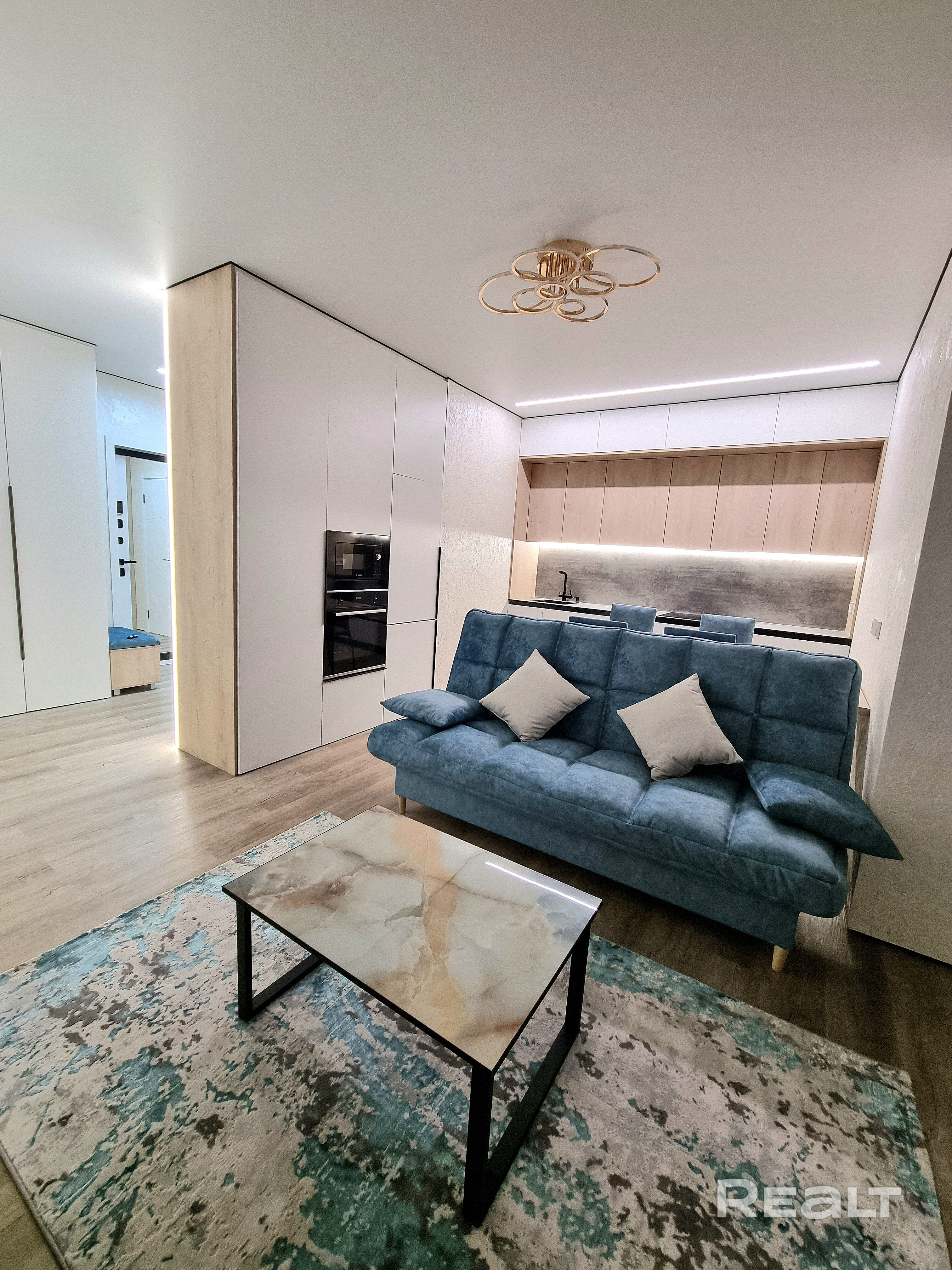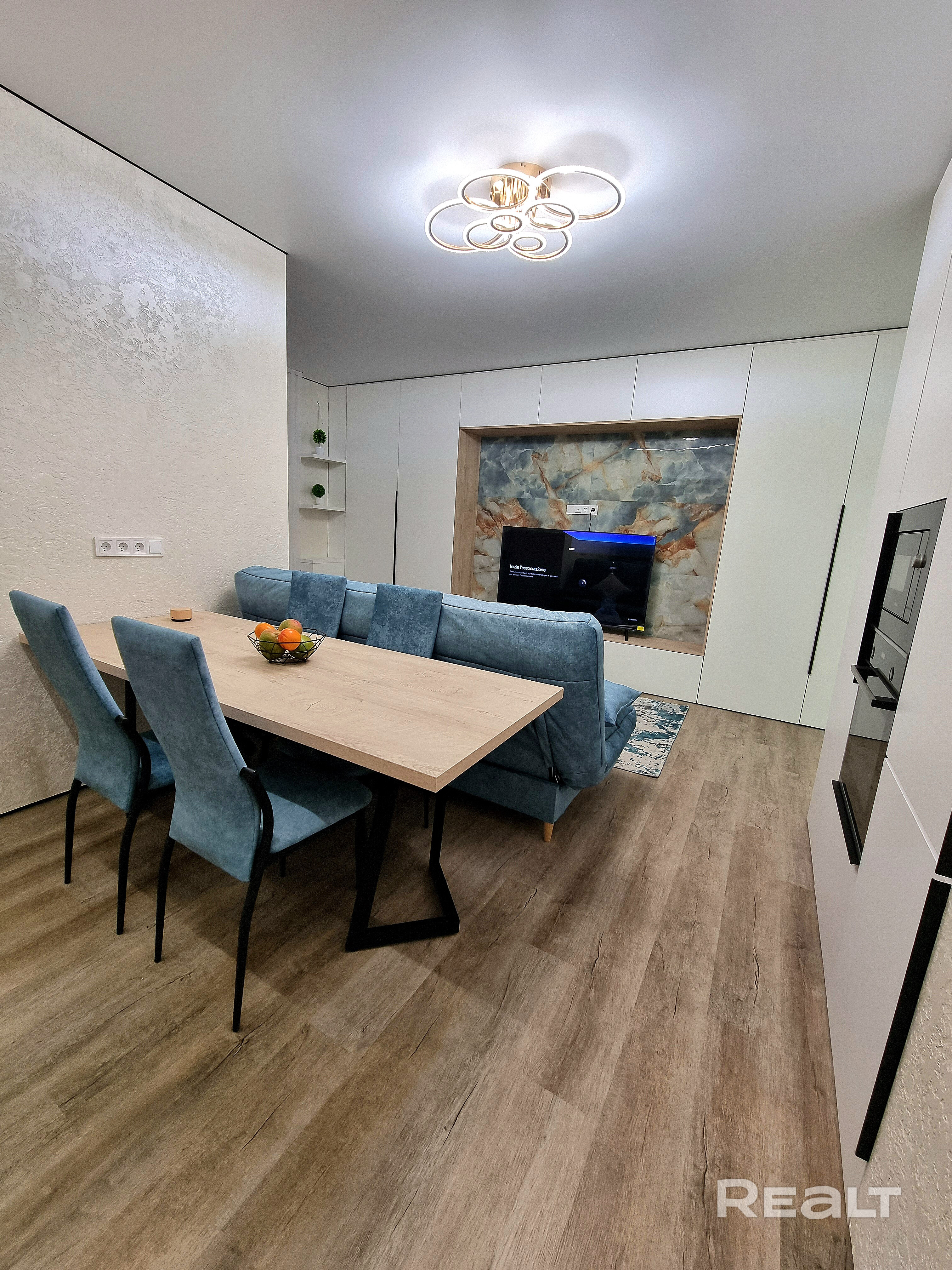 Квартира 46,5 м2 по СНБ в Минск Мире. Дизайнерский современный ремонт. На полу влагостойкий кварцвинил с теневым плинтусом и подсветкой, на стенах декоративная штукатурка. В квартире реализована система "Умный дом" Квартира полностью меблированная, большое количество места для хранения, вся мебель встроенная, сделана под заказ по индивидуальному проекту. Установлена стиральная машина Samsung. На кухне вся техника встроенная Bosh. Звоните, ответим на все вопросы. Вышлем видео по запросу.