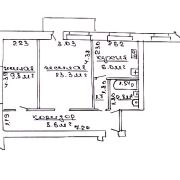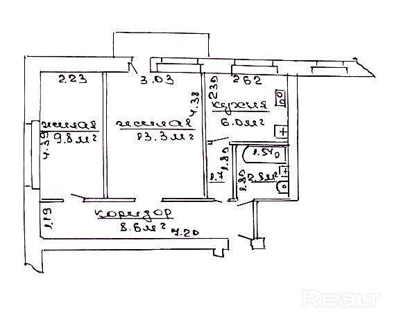 Квартира состоит из двух жилых комнат (9,8 кв.м. и 13,3 кв.м.), кухни (6,0 кв.м.), прихожей (8,6 кв.м.), коридора (1,7 кв.м.), совмещённого санузла (2,8 кв.м.), балкона (0,6 кв.м.). Высота помещения 2,49 м. Площадь по СНБ 42,8 кв.м.