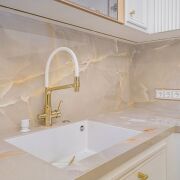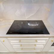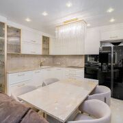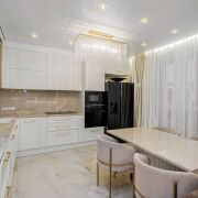 • Современная кухня с всей необходимой техникой (холодильник, посудомоечная машина, духовой шкаф) и функциональными шкафами, готовая к использованию.