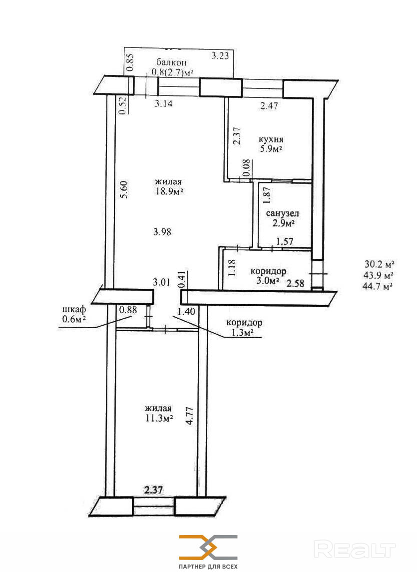Продается 2-комнатная квартира в г. Минске, по ул. Волоха, 59. Площадь квартиры по СНБ 44.7 м.кв, жилые комнаты 18.9 м.кв. и 11.3 м.кв., кухня 5.9 м.кв.