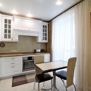 -потолки из экологически чистого материала – гипсокартона, на кухне – матовый натяжной потолок;