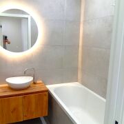 В квартире оштукатурены и выровнены стены, полностью сделана электрическая разводка, уложена качественная плитка в сан узле и установлена сантехника, также сделан вывод под кондиционер.