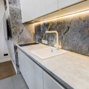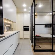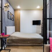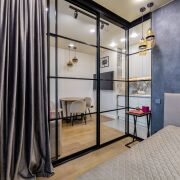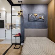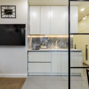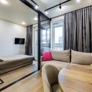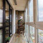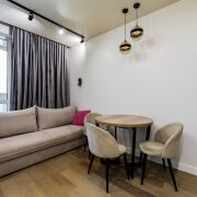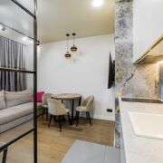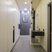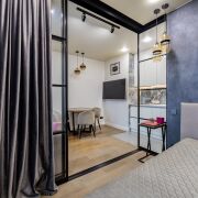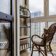 -В квартире сделан современный ремонт. Использованы только качественные материалы. Всё сделано со вкусом. Освещение в квартире очень продуманное с разными сценариями. Для хранения всего необходимого есть шкафы.