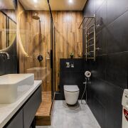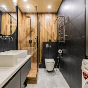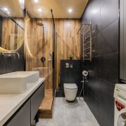 -Санузел совмещенный, что делает его очень удобным и функциональным. Стильный с хорошей подсветкой, душевой кабиной, хозяйственный шкаф.
