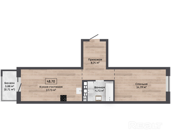 - Формат: евродвушка - просторная кухня-гостиная + комната;