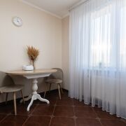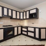 Кухня оборудована: духовой шкаф, газовая варочная поверхность, вытяжка, удобные шкафы.