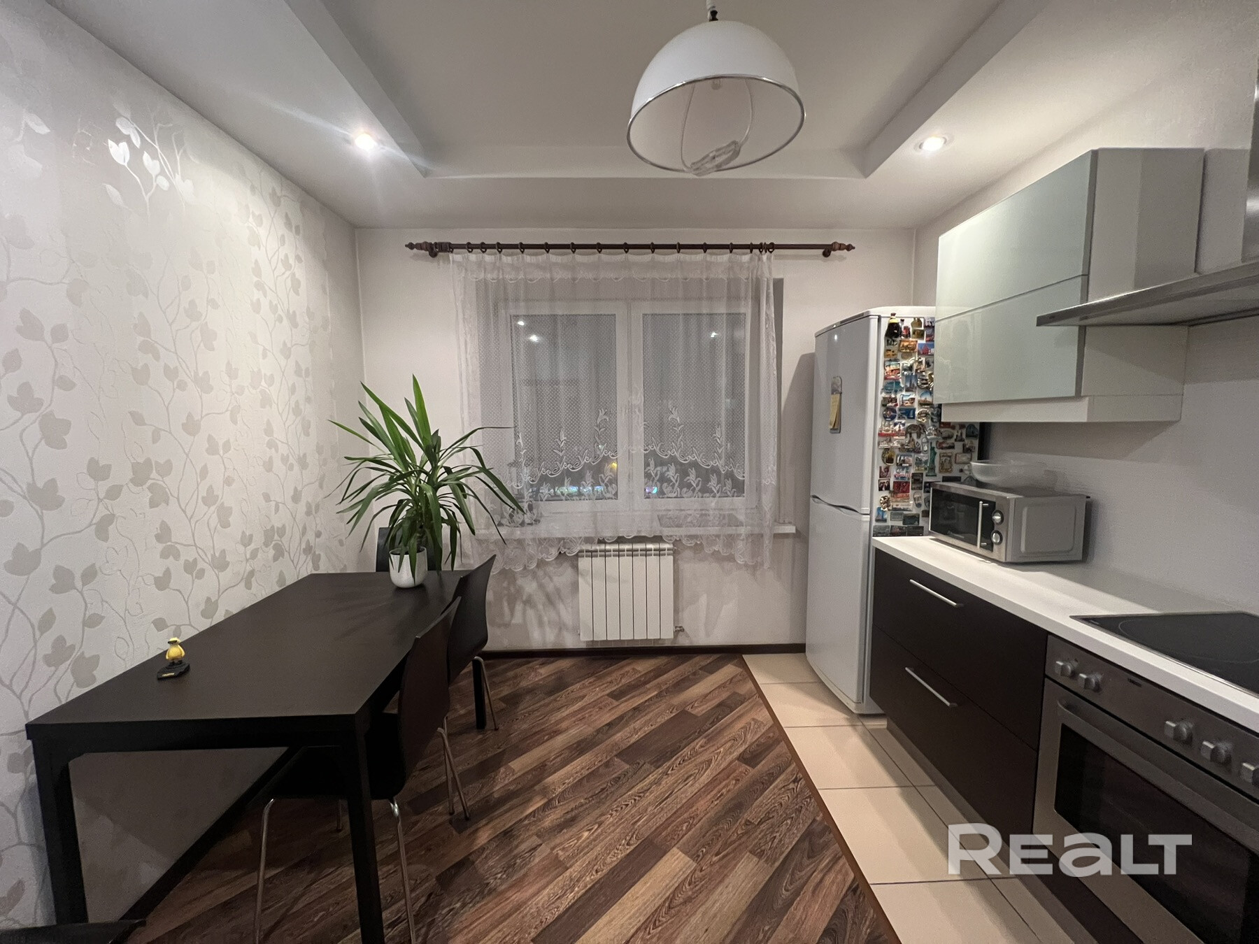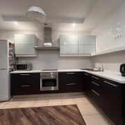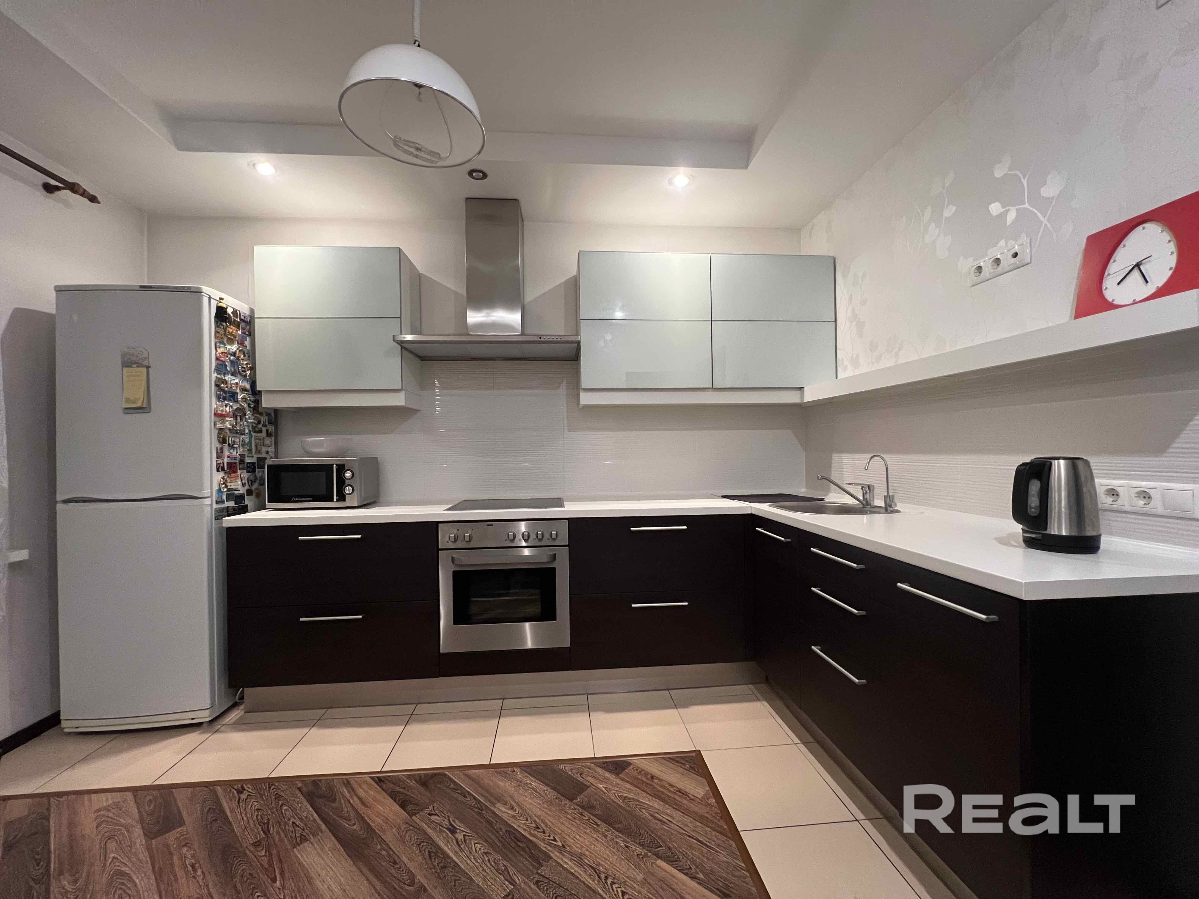 Встроенная кухня с бытовой техникой.Много мест для хранения всего необходимого. Установлен фильтр для очистки воды. Дополнительное освещение зоны приготовления еды. Потолки многоуровневые. На полу плитка и ламинат.