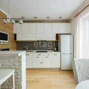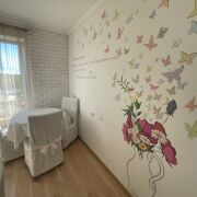 Особая гордость квартиры – кухня с эксклюзивной ручной росписью. Это не просто интерьер, а художественный акцент, который делает пространство уникальным и подчеркивает индивидуальность владельца. Здесь хочется принимать гостей, создавать кулинарные шедевры и наслаждаться моментом. Французское окно, добавляющее пространству легкости и света, когда оно открыто, кухня «дышит», сливаясь с окружающей зеленью, а пространство расширяется, давая ощущение просторной летней террасы. Идеально для семейных обедов и вечерних посиделок с друзьями