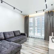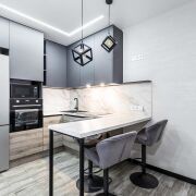 -Интерьер выполнен в едином современном стиле, без визуального шума и спорных решений. Кухня компактная, но функциональная: встроенная техника, подсветка рабочей зоны, фартук под камень, барная стойка вместо громоздкого стола - это экономит место и делает кухню удобной в повседневной жизни.