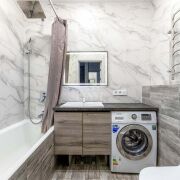 -Санузел совмещенный, облицован плиткой в спокойной серой цветовой гамме, установлена тумба с раковиной и встроенной стиральной машиной - всё компактно, функционально и без ощущения тесноты.