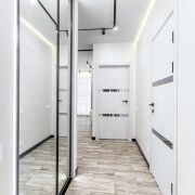-Прихожая выдержана в общем стиле квартиры. Зеркальный шкаф увеличивает пространство и сразу решает вопрос хранения верхней одежды и обуви. Входная дверь массивная, с современными замками - ощущение надёжности с порога.