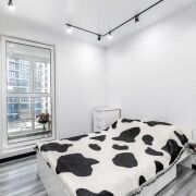 -Спальня оформлена в нейтральных оттенках, что позволяет легко адаптировать пространство под себя. Большой зеркальный шкаф-купе визуально расширяет комнату и закрывает вопрос хранения. Есть удобная двуспальная кровать.