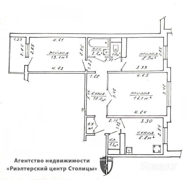 Общая площадь: 65 кв.м (жилая 35 кв.м, кухня 8.8 кв.м).