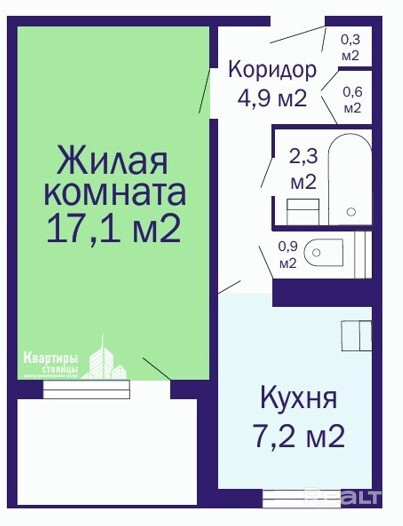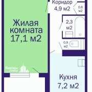 - Просторная жилая комната 17.1 м2 с вместительным встроенным шкафом. Имеет выход на застекленную лоджию.