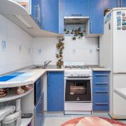 Кухня встроенная угловая, оснащена бытовой техникой: газовая плита, вытяжка, холодильник.