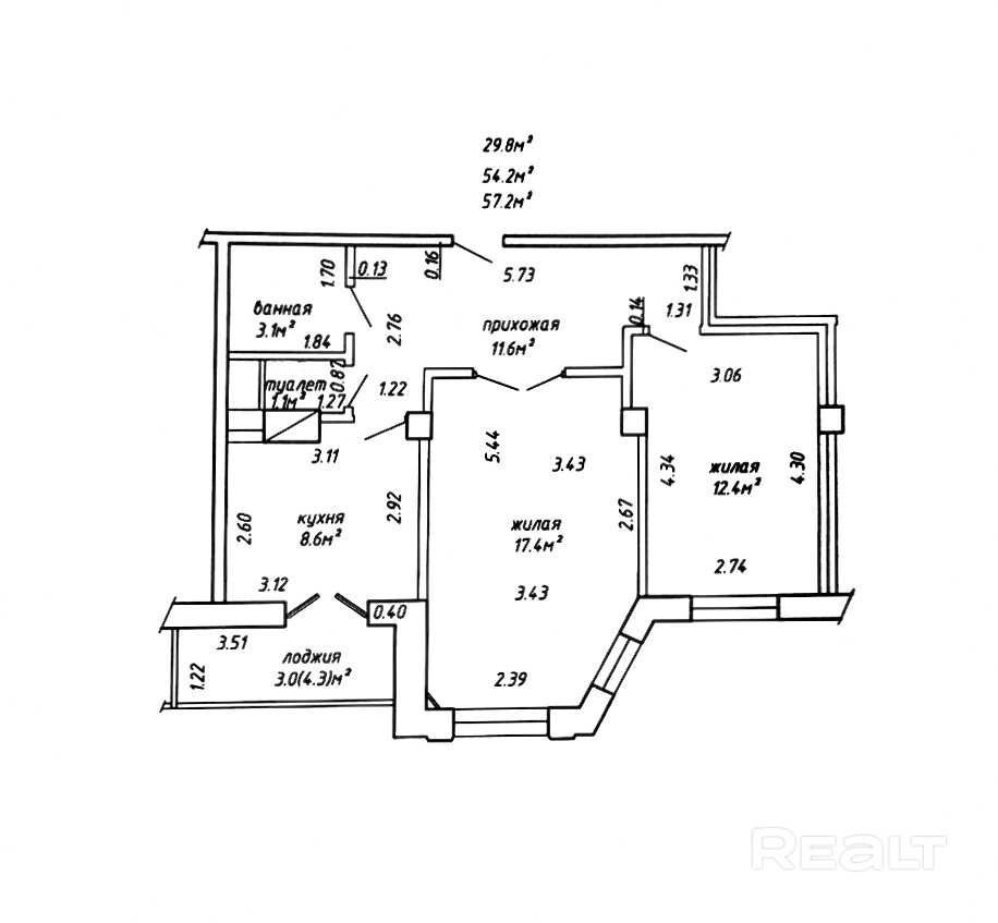 Общая площадь указана по СНБ (с учётом лоджии) - 57.2м2