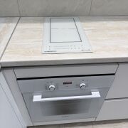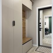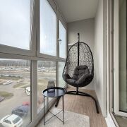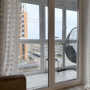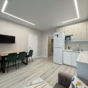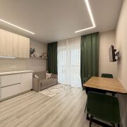 Встроенная кухня с доводчиками Blum, подсветкой рабочей зоны и техникой (индукционная варочная поверхность, духовой шкаф, вытяжка, посудомоечная машинка и холодильник). Гостиная оснащена стильной обеденной группой, диваном со спальным местом и телевизором. Панорамный выход на лоджию, которая застеклена в пол и имеет дополнительное хранение в виде шкафа.