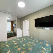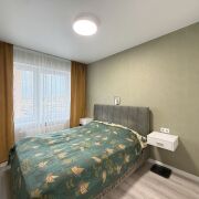 Изолированная спальня оснащена кроватью с подъёмным механизмом, прикроватными тумбочками и вместительным шкафом купе.