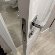 Частично добавлена новая электрика, напольное покрытие-ламинат, стены оклеены однотонными обоями, потолок матовый натяжной с точечными светильниками и парящими линиями.