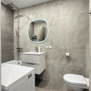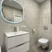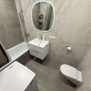 Санузел облицован керамогранитом, установлена инсталляция, подвесной унитаз, металлическая ванна увеличенного размера, подвесная тумба с раковиной, зеркало с подсветкой, стирально-сушильная машинка LG, а все коммуникации спрятаны за скрытым люком.
