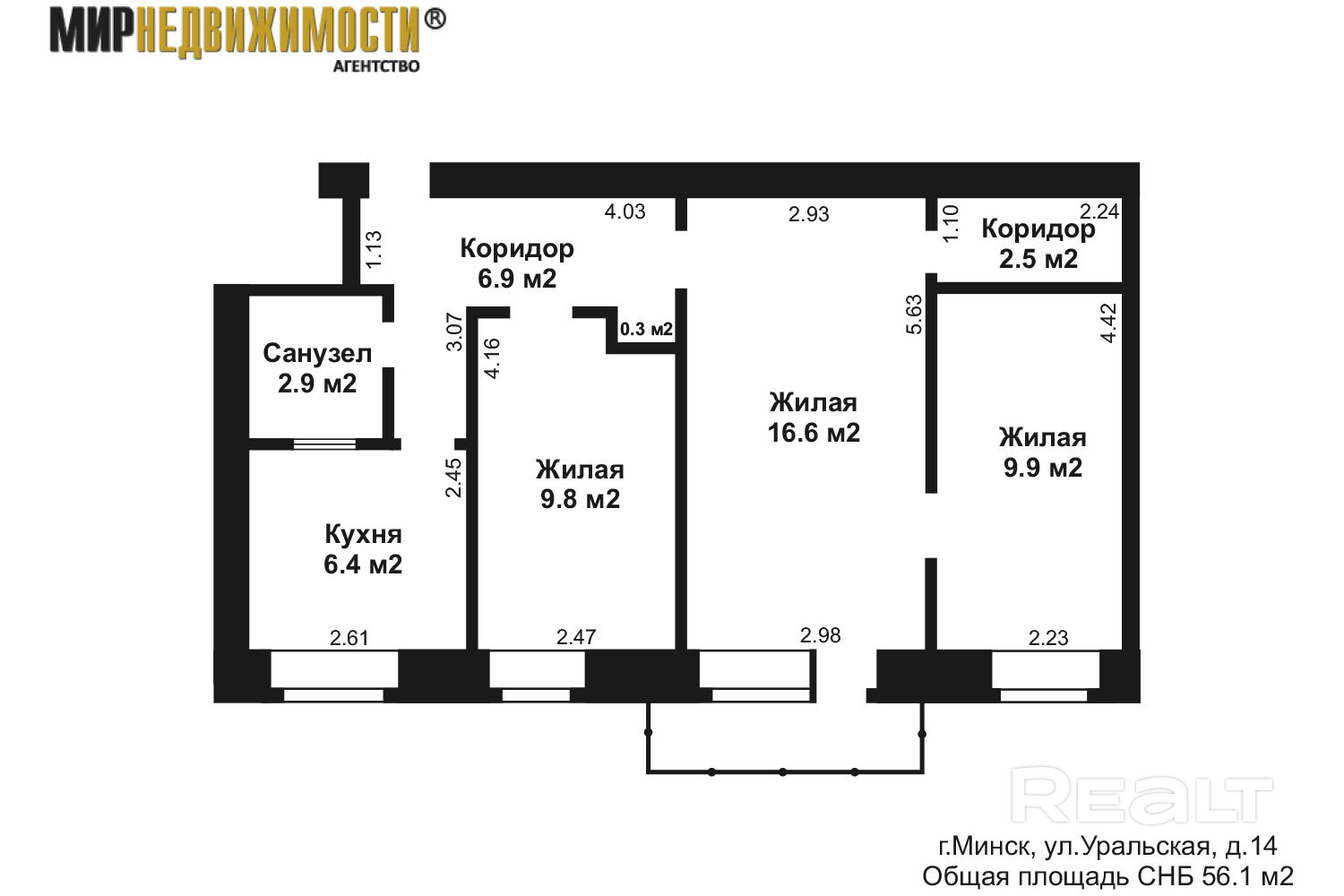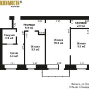 Общая площадь по СНБ 56,1 м2, жилая площадь 38,8 м2, кухня 6,4 м2.