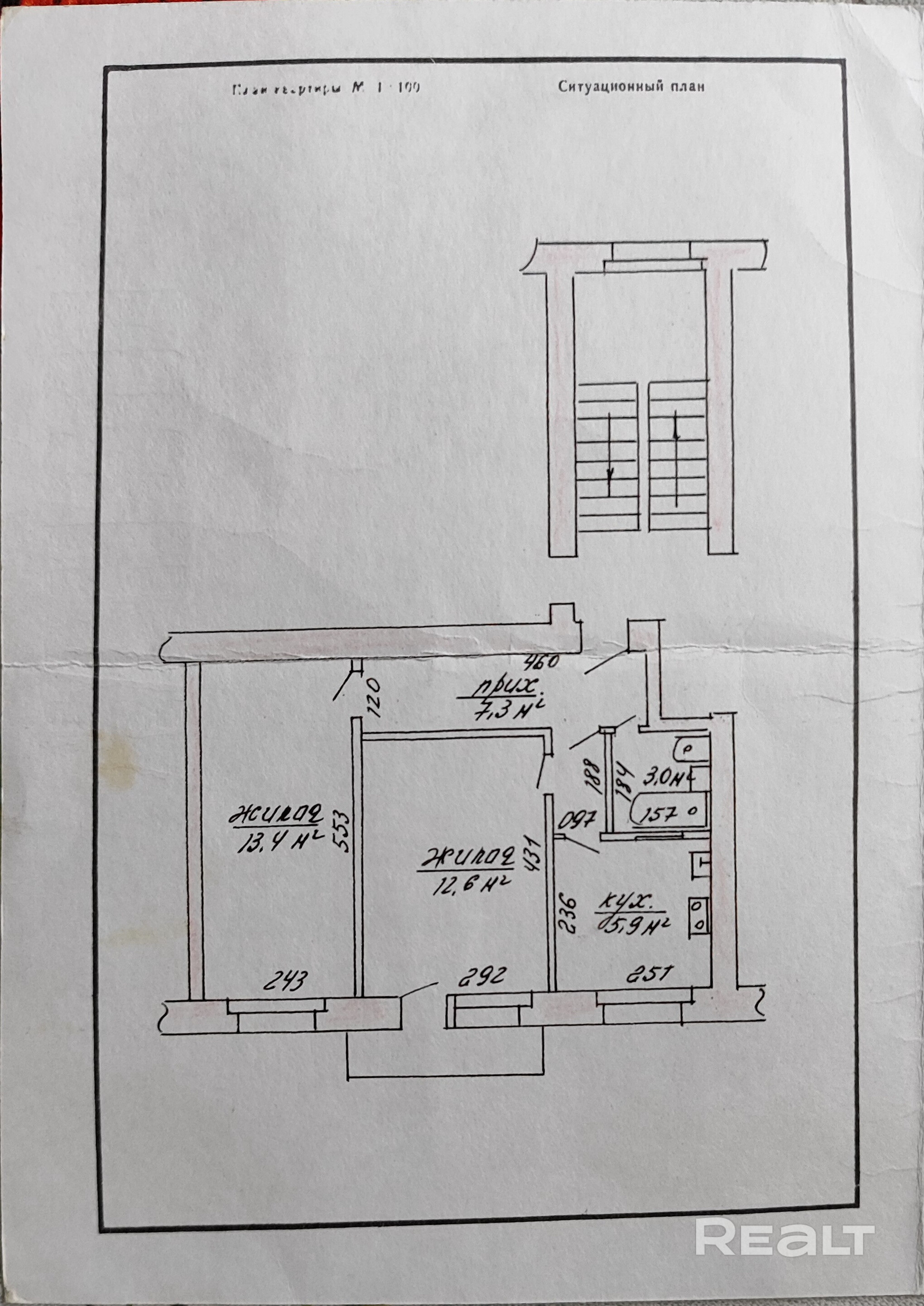 Площадь квартиры общая 42.2, по СНБ - 43м кв Комнаты изолированы 13.4 и 12.6 кв м , кухня 5.9 кв.м. Высота потолков - 2.5 м. Сан узел совмещенный 3 кв м и прихожая 7.3 кв м, есть подвал