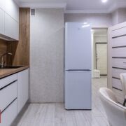 Встроенная кухня полностью оснащена необходимой бытовой техникой премиум сегмента – СВЧ-печь, индукционная варочная панель, духовой шкаф, вытяжка, холодильник, фильтр для очистки воды.