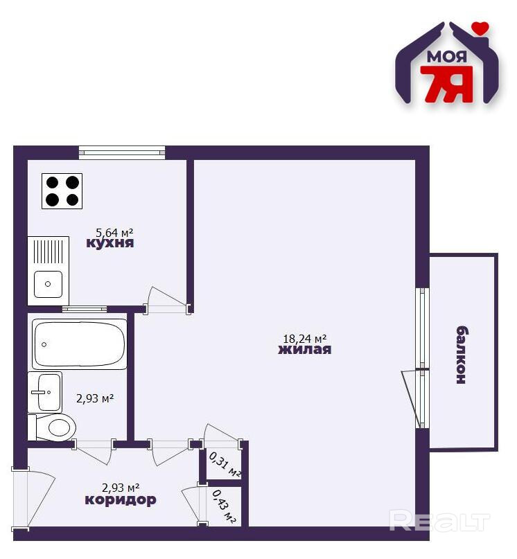 - Квартира светлая, с продуманной планировкой: просторная жилая комната площадью 18,24 м2, аккуратная кухня 5,64 м2, где легко разместится все необходимое, а также совмещенный санузел и удобный коридор с нишей под шкаф или систему хранения. Из комнаты есть выход на балкон, где можно обустроить уютное место для отдыха или мини-зимний сад.