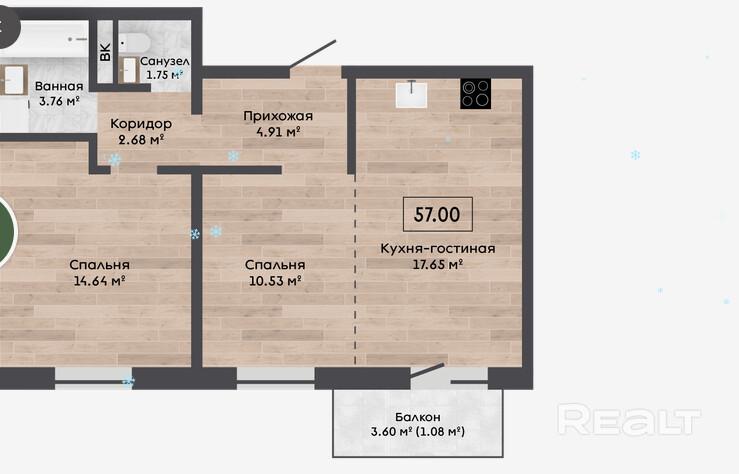 Квартира с кладовой 3,32м2.