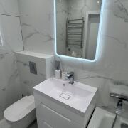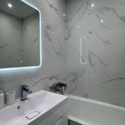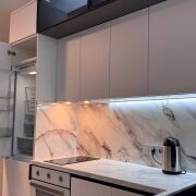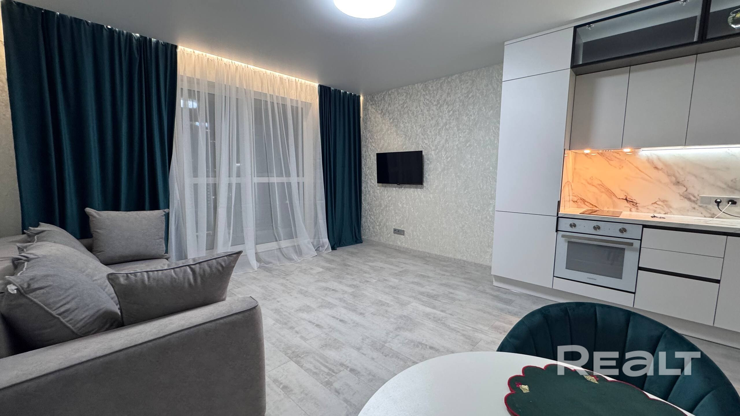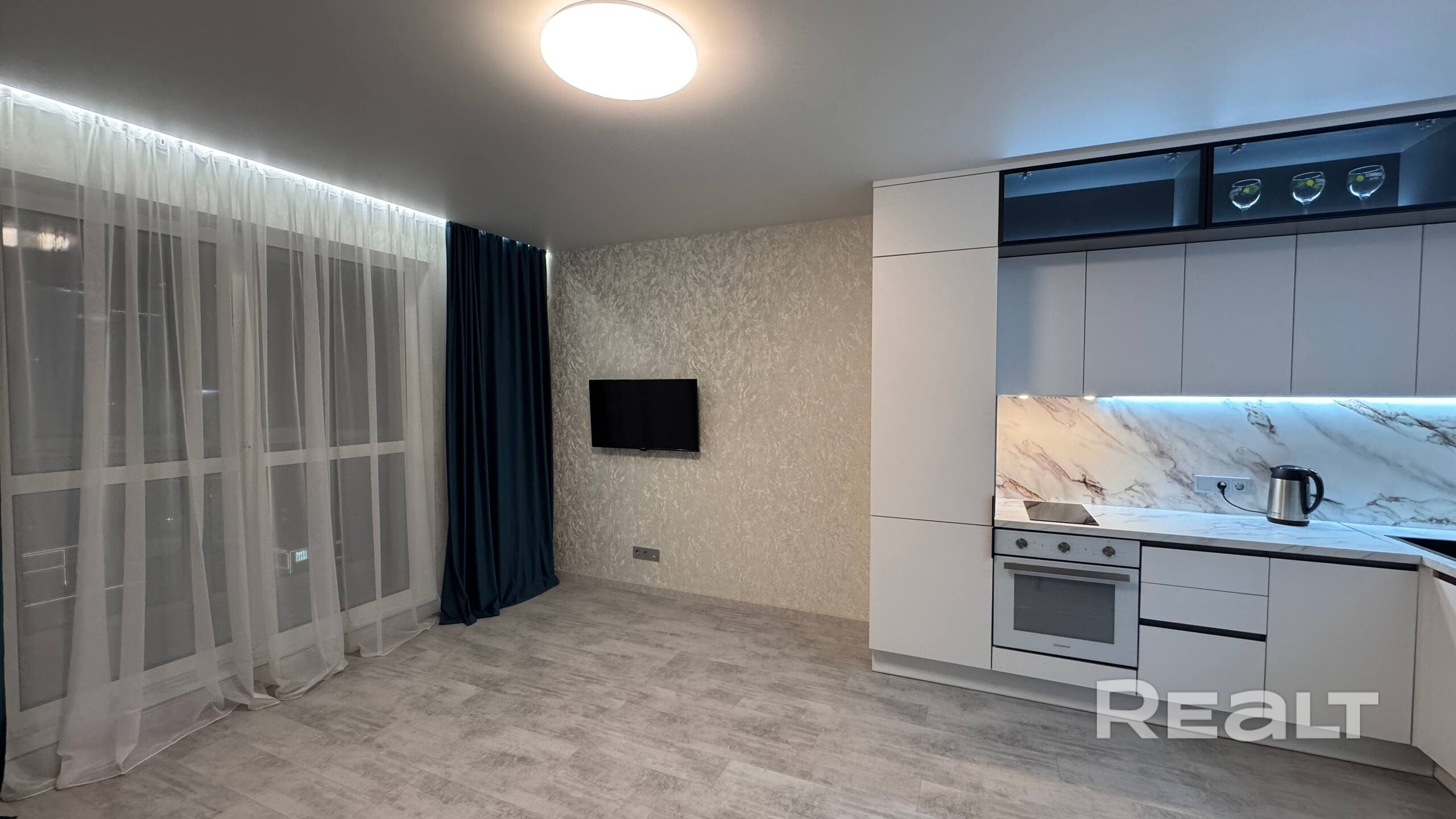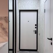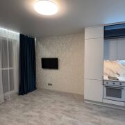 Установлена надежная входная дверь. В жилых зонах — премиальный ламинат, в санузле — итальянская плитка высокого класса. Парящий потолок с подсветкой создаёт уют и современную атмосферу.